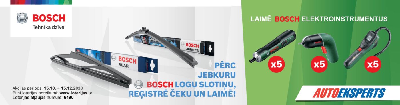 Pērc un laimē! Līdz 15. decembrim iegādājies jebkuru Bosch automašīnas logu slotiņu, reģistrē pirkuma dokumentu un laimē kādu no Bosch akumulatora skrūvgriežiem vai gaisa pumpi. Loterijas noteikumi un čeku reģistrācija šeit: https://www.loterijas.lv/loterija/perc-un-laime-4/ Izloze notiks 16.decembrī. Loterijas atļaujas numurs: 6490
