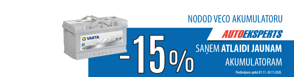 Visu novembra mēnesi nodod veco akumulatoru un saņem atlaidi -15% jauna iegādei AUTOEKSPERTS veikalā. Piedāvājums spēkā no 01.11.-31.12.2020.