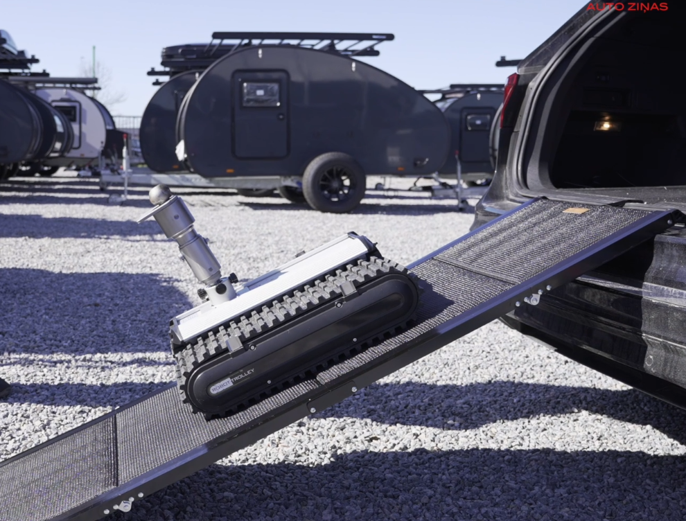 Robot Trolley ir pasmags, vairāki desmiti kilogramus, taču tas prot pats pa īpašu rampu iebraukt automašīnas bagāžniekā vai piekabē.